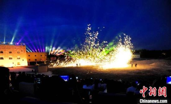 圖為沙漠實(shí)景劇《敦煌盛典》的演出現(xiàn)場,觀眾在“穿越”古今的賞劇體驗(yàn)中感觸絲路文化?!】靛\虎 攝