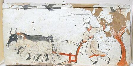 此后,在酒泉丁家閘十六國墓壁畫中就只有一牛牽引的雙轅犁了。說明魏晉時期是中國從二牛單轅犁過渡到一牛挽拉雙轅犁的時代,這一過渡的狀況及特點出現(xiàn)在嘉峪關地主墓葬壁畫中,又說明甘肅是這一重大農技改革的地區(qū)之一。