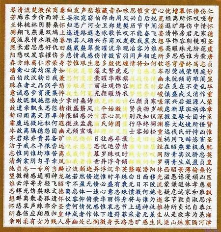 蘇蕙《璇璣圖》不僅是一束厚重的文學(xué)奇葩,也是一幅充滿創(chuàng)意的藝術(shù)巨制。她將詩歌的載體從傳統(tǒng)簡帛紙張轉(zhuǎn)換成為錦。錦是有彩色花紋的高級(jí)絲織品。以錦為書寫材料制作《璇璣圖》,除詩歌本身的創(chuàng)作外,首先需要染絲紡織。錦織好后,又要對(duì)《璇璣圖》謀篇布局,劃區(qū)設(shè)色,書詩于錦,然后一針一針地將它繡出來,變?yōu)榛匚腻\字。那每一道工序,要求都極精細(xì),不得有半點(diǎn)疏忽,不然就會(huì)留下污點(diǎn)和遺憾。蘇蕙集眾藝于一身,完美地將其制作出來,體現(xiàn)了她的綜合藝術(shù)才能。取名“璇璣(泛指北斗)圖”,寓意它像北斗,可以旋轉(zhuǎn)地讀。它是在華美的錦上,又以五彩繽紛的絲線繡上《璇璣圖》,不僅顏色更加艷麗,而且那841個(gè)金玉珠璣般文字,展現(xiàn)的令人眼花繚亂的詩歌園地,更是前不見古人,后不見來者,比錦繡的光彩更加耀眼奪目。
