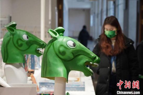 1月14日,甘肅省博物館文創(chuàng)中心的銅奔馬頭套吸引參觀者駐足觀看。連日來(lái),甘肅省博物館文創(chuàng)中心推出的以銅奔馬為主題的文創(chuàng)產(chǎn)品,如“神馬來(lái)了”銅奔馬頭套,“綠馬”出行口罩等產(chǎn)品備受歡迎。