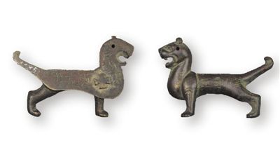 銅虎符(圖③)高4.7厘米、長6.9厘米?;A豎耳,怒目張口,挺胸昂首,尾上翹,作奔走狀。符頭部有圓穿孔,背面有凸起的十字扣。符身正面陰刻篆書“永安府”字樣,背面陰刻楷書“右翊衛(wèi)”“右驍衛(wèi)”“永安四”“蘭豐二”等字樣。右翊衛(wèi)、右驍衛(wèi),官署名,為隋唐十六衛(wèi)中的兩衛(wèi)。隋初稱左右衛(wèi),隋煬帝時(shí)改為左右翊衛(wèi),所領(lǐng)軍士稱驍騎。館藏虎符出土于甘肅莊浪,是隋代府兵駐防莊浪的歷史見證,是研究隋代府兵制度的重要實(shí)物資料。