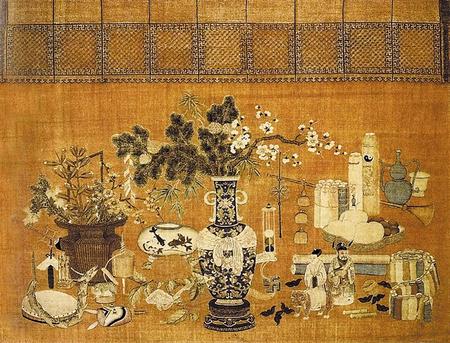 百寶嵌歲朝吉祥御制題詩(shī)掛屏,使用各種瓷、玉、寶石、金銀材料鑲嵌而成,也只有皇家才能制作。其中各部分零星擺放,相互之間無(wú)甚關(guān)聯(lián),已經(jīng)出現(xiàn)歲朝圖圖案化的苗頭。在后來(lái)的發(fā)展中,歲朝清供圖演變成裝飾圖案,出現(xiàn)在服飾、建筑等藝術(shù)中。