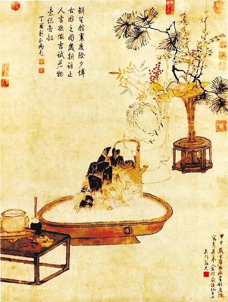 類(lèi)似的畫(huà)作還有明代吳門(mén)畫(huà)派張宏的作品。畫(huà)面中心的榾柮爐中溫著一壺酒。后側(cè)果盤(pán)中盛放佛手,插花的器物則是枯瘦的青銅花觚和清麗的白瓷瓶,所插之物相應(yīng)地配以墨線(xiàn)勾勒的梅柏和淡雅設(shè)色的天竹。