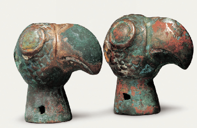 鷹是一些游牧民族崇拜的猛禽,十分威猛。青銅鷹首為軸桿類頂端的飾物,部族首領(lǐng)手執(zhí)桿頭有鷹首的器物以象征權(quán)威和神圣。