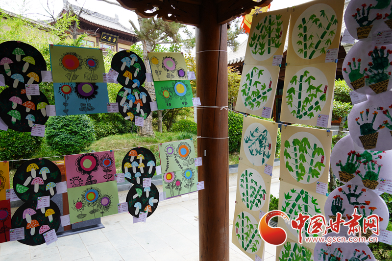 天水古城里的長(zhǎng)廊上展示著孩子們的繪畫、手工作品,將兩側(cè)長(zhǎng)廊掛滿,不少人駐足觀賞。