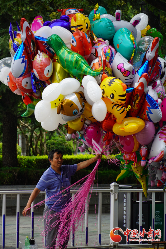 天水古城附近,在街邊做小生意的男子正在整理氣球。