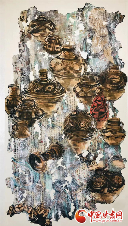 他的這幅作品《絲路遺珍-馬家窯》于2018年獲甘肅美術(shù)專業(yè)最高獎(jiǎng)“金駝獎(jiǎng)”,采用黃河的“s”型構(gòu)圖展開,將八千年前新石器時(shí)代大地灣文化、馬家窯文化的經(jīng)典代表器物分次展開。作品左上角及中間部分依次疊加,穿插,繪制中與敦煌文化中的壁畫、飛天、佛像有機(jī)結(jié)合,寓示絲路文化有序傳承、源遠(yuǎn)流長(zhǎng),又對(duì)畫面的視覺撥高提升。