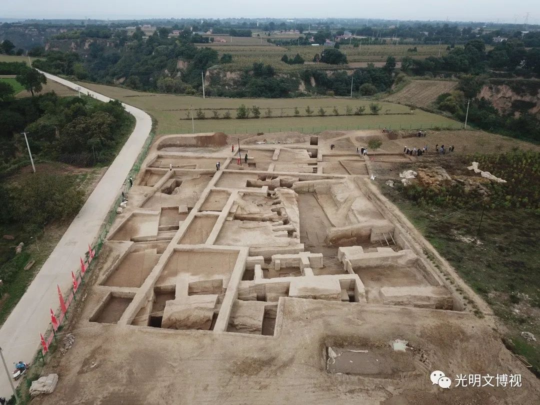 甘肅慶陽西峰西郊的南佐遺址,坐落在黃土高原第一大塬——董志塬上,傳說中這里是黃帝部族的重要活動地域,也是以農(nóng)業(yè)著稱的周人祖先不窋?shù)睦霞摇D献暨z址發(fā)現(xiàn)于1958年,1984—1986年和1994—1996年有過兩個階段的發(fā)掘,從2021年開始第三階段的發(fā)掘和調(diào)查、勘探工作,基本確認這是一處以仰韶文化晚期大型聚落為主體的遺址,遺址面積在600萬平方米以上,可能有外環(huán)壕。聚落中部是由9座方形夯土臺及其環(huán)壕圍成的面積約30萬平方米的核心區(qū),核心區(qū)中部偏北是數(shù)千平方米的由“護城河”和夯土宮墻圍成的“宮城”。“宮城”中心為主殿,“九臺”之外還有多處居住區(qū)、夯土臺、溝渠水利設(shè)施等遺存,出土了大量白陶、黑陶等珍貴遺物和大量水稻,從多個方面顯現(xiàn)出早期國家和文明社會的氣象。