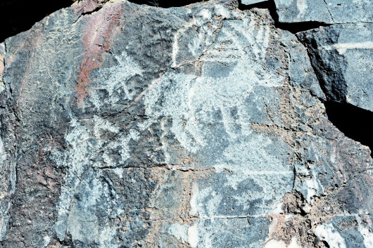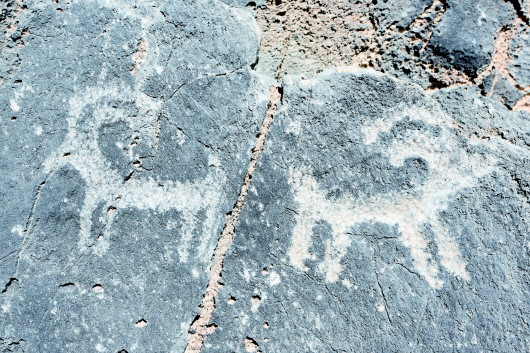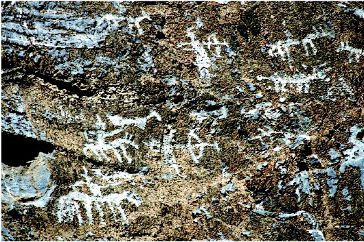 肅北縣大黑溝巖畫是全國重點文物保護單位,巖畫形成時間初步斷定在春秋、戰(zhàn)國至西漢時期,位于肅北縣城東約40公里處的大黑溝。巖畫共有34組,圖案190多幅,零亂分布在3.5公里長的山溝中,畫面內(nèi)容多為射獵、放牧、練武、乘馬作戰(zhàn)等場景和北山羊、野牛、野駱駝等動物,畫面表現(xiàn)形式多以凹刻和凸刻,巖畫大多刻在避風(fēng)向陽的陡峭花崗巖和石灰石上。