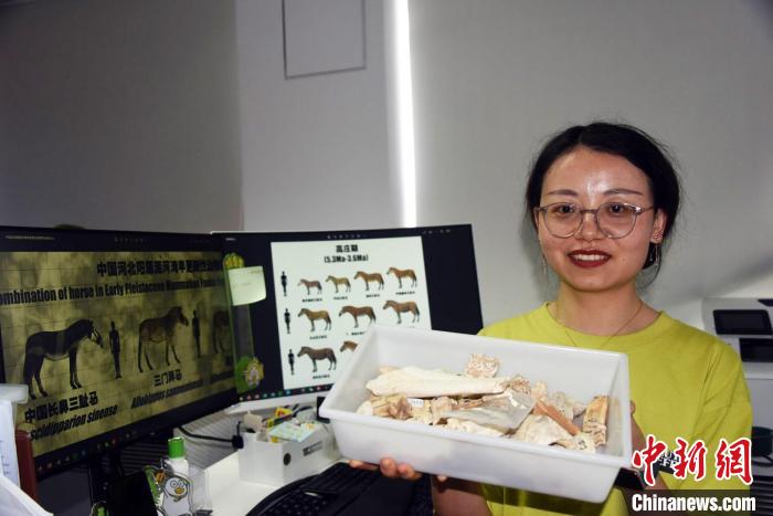 馬姣在辦公室展示介紹用于本次研究的部分馬化石樣品?!≈行律缬浾?nbsp;孫自法 攝