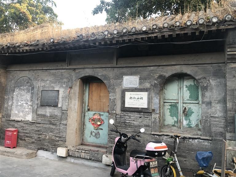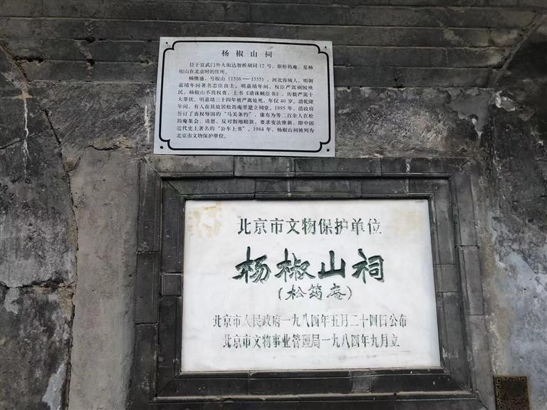 就是在這個(gè)胡同里,我看到一個(gè)歇山式屋頂?shù)姆课荩严喈?dāng)?shù)钠茢?,屋頂上長(zhǎng)滿了凄凄荒草,門(mén)窗皆已破爛不堪。但是門(mén)旁的墻壁上卻鑲嵌著一塊匾,近前一看,上面寫(xiě)著“楊椒山祠”。喲,這就是楊椒山在北京的祠。