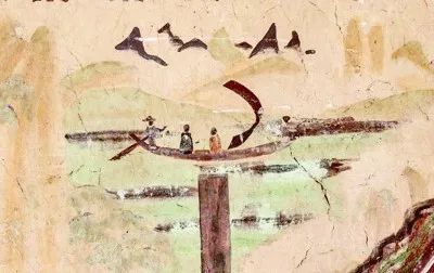 同樣是水上活動的操舟,在敦煌壁畫中也有多種表現(xiàn)。無論是舟的形制,還是操舟者的運(yùn)行方式,都極為形象地展現(xiàn)在壁畫中。在時代為北周的莫高窟296窟中,有一艘正在水中航行,船體較短的獨(dú)木舟,尖頭尖尾,中間大、兩頭小。獨(dú)木舟中間乘坐三人,船頭船尾各有一名赤膊強(qiáng)健的水手在搖櫓與撐篙。這一畫面體現(xiàn)了人們于水中蕩舟的活動場景。而在時代為初唐的莫高窟323窟中,壁畫中展現(xiàn)的操舟形象卻是另一番場景,畫面中的船雖然仍是一葉扁舟,但舟身上部設(shè)置了風(fēng)帆,用于劃船的櫓也很清晰,類似今天的搖櫓帆船。舟行水中,風(fēng)帆鼓浪,前有一人撐槳,整體呈現(xiàn)出一幅“風(fēng)帆欲起橫江上,水影遙看海上天”的運(yùn)動場景(圖①)。