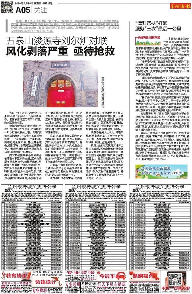 2020年3月20日《蘭州晨報(bào)》刊登呼吁搶救五泉山劉爾炘對聯(lián)的報(bào)道。