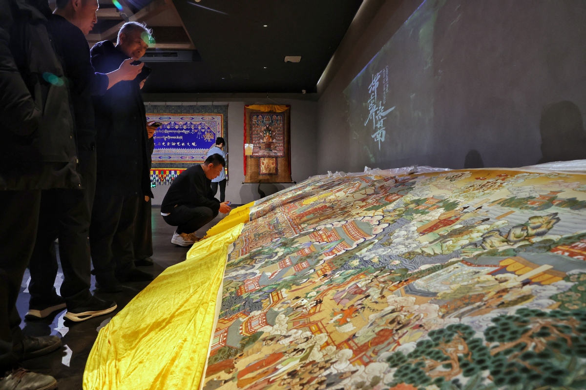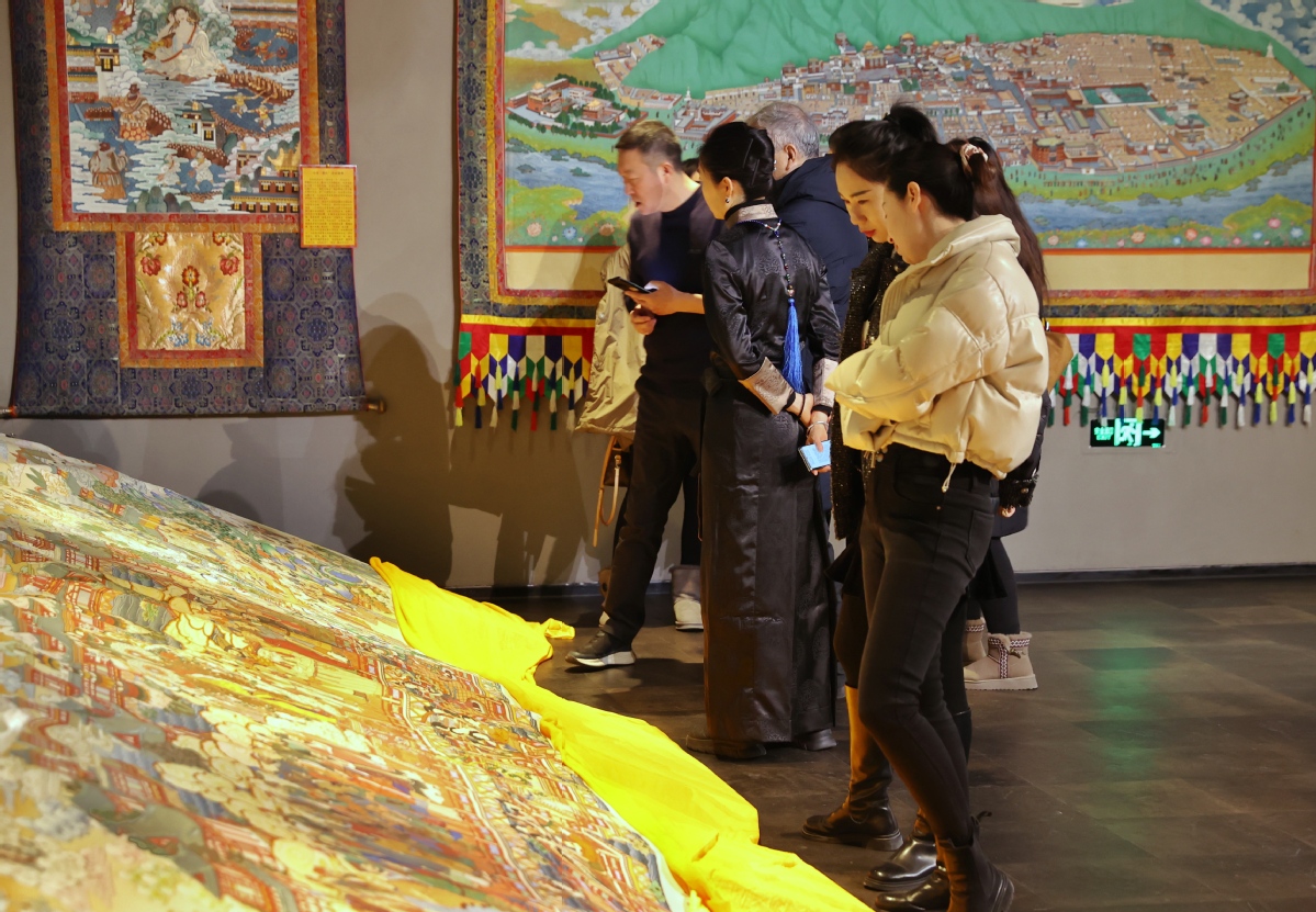 ?。ㄓ浾?nbsp;姜東)2023年12月26日,北京,觀眾在皇城藝術(shù)館參觀《甘肅甘南非遺文化藝術(shù)展》。近日,《甘肅甘南非遺文化藝術(shù)展》在北京皇城藝術(shù)館開展。此次展覽主要展示了甘南藏族自治州非物質(zhì)文化遺產(chǎn)藝術(shù)作品《拉卜楞文化歷史彩繪藝術(shù)大觀》《藏族書法瑰寶》及甘南拉卜楞文創(chuàng)產(chǎn)品。