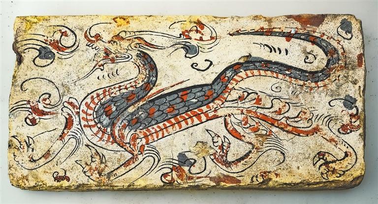 中國(guó)人恪守天人合一、陰陽平衡、五行生克的風(fēng)水理論,風(fēng)水中龍脈對(duì)人心理的影響深遠(yuǎn),使得龍?jiān)诮ㄖb飾、墓葬中普遍應(yīng)用,成為中國(guó)建筑裝飾藝術(shù)的瑰寶。隨著兩漢磚室墓的出現(xiàn)和流行,由星辰崇拜衍生而來的四靈形象,逐漸成為墓葬建筑裝飾的重要元素,如金昌市博物館藏的魏晉青龍磚,龍首高昂,龍須上揚(yáng),曲頸挺胸,張口吟嘯,前肢登騰,后肢做行進(jìn)狀,周圍環(huán)繞云氣紋,有隨云彩而飛動(dòng)之感。