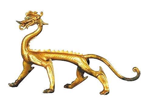 河南偃師的二里頭遺址出土了夏代龍文物,說明此時(shí)龍已經(jīng)成為身份、地位的象征。商代開始,龍的突出特征便是有了角,并多以夔龍紋等形象出現(xiàn)在青銅器上。春秋戰(zhàn)國(guó)時(shí)代是一個(gè)大變革、大發(fā)展的時(shí)代。與政治上諸侯爭(zhēng)雄、思想界百家爭(zhēng)鳴、陰陽學(xué)說盛行相適應(yīng),龍的圖案中出現(xiàn)了“群龍”和“交龍”形象。如甘肅省博物館收藏的戰(zhàn)國(guó)盤龍紋金飾片,兩條龍交叉盤繞,龍首一側(cè)飾兩條小龍,龍尾一側(cè)飾一對(duì)小虎,作咬噬龍尾狀,龍身上飾聯(lián)珠紋。隨著華夏大地結(jié)束戰(zhàn)亂,走向一統(tǒng),秦漢時(shí)代的龍出現(xiàn)相對(duì)規(guī)范和定型的趨勢(shì),并出現(xiàn)了背上長(zhǎng)翅膀的龍。魏晉南北朝時(shí)期龍形象對(duì)內(nèi)融合各少數(shù)民族文化,對(duì)外融合佛教文化,流行的龍紋頭部扁長(zhǎng),角似鹿角,發(fā)鬣后披,挺胸奮肢,呈現(xiàn)出矯健奔放、線條流暢、氣韻生動(dòng)的特點(diǎn)。