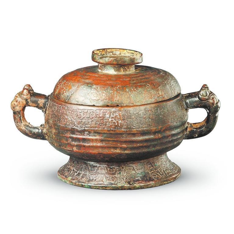 中國(guó)國(guó)家博物館收藏的秦公簋,1921年甘肅天水出土,簋呈圓形,蓋與器身相合成一略扁而圓的形體,蓋頂有圓形捉手,蓋邊緣及器口下飾勾連形蟠螭紋。蟠螭紋又稱(chēng)交龍紋,流行于春秋中晚期至戰(zhàn)國(guó)早期,有一種由兩條或兩條以上小龍相交,組成紋飾單元,密布于器物表面。