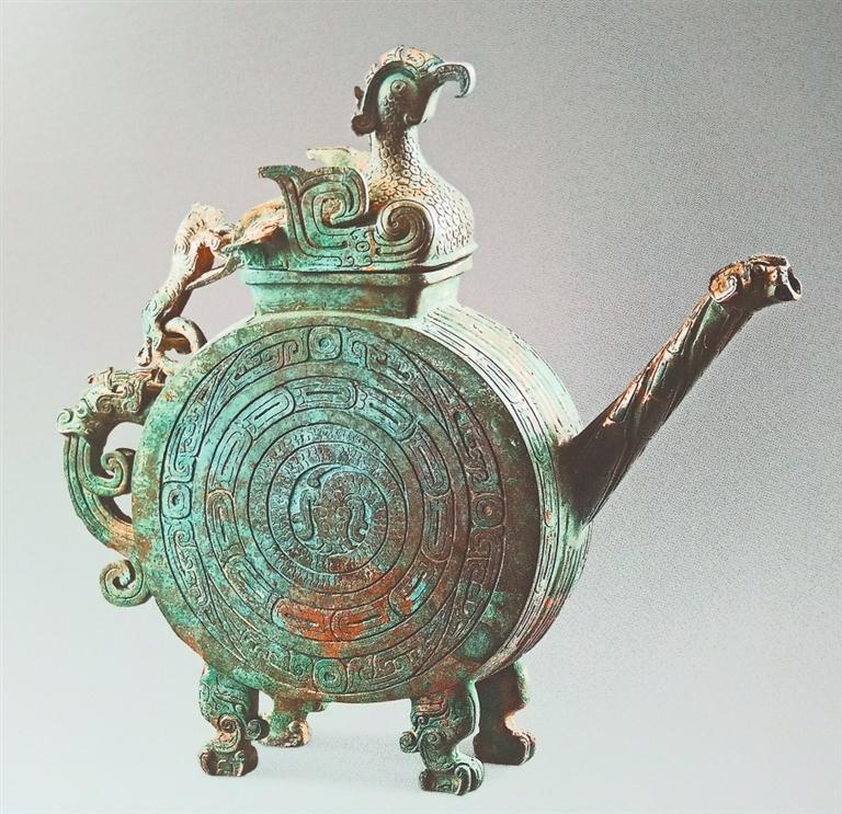 陜西寶雞出土的逨盉,酷似現(xiàn)代的扁圓形壺,器身呈扁圓形,長(zhǎng)方形口上有鳳鳥(niǎo)形蓋。鳳鳥(niǎo)引首高昂,喙微卷曲,振翼欲飛。器身與蓋用虎形鏈及雙環(huán)相連,虎作向上爬行狀,頭左偏而尾上卷。直管狀流,流端作龍首狀。鋬呈龍首向下噴水狀,下有四獸足。腹部?jī)蓚?cè)紋飾相同,分別由三圈組成,由外向內(nèi)依次為變體夔龍紋、重環(huán)紋和蟠龍紋。逨盉是祭祀禮器,它將天上飛的鳳鳥(niǎo)、地上跑的猛虎、水里游的蛟龍,作為溝通天地、人神的使者,使天地人三者合而為一。由于周人將動(dòng)物視為具有無(wú)限神力之神靈,因此青銅器上之動(dòng)物紋樣,除宗教祭祀意涵外,也富有一定的政治意義。貴族通過(guò)青銅器上神秘肅穆的動(dòng)物紋樣,令人望之崇敬生畏,以威嚇被統(tǒng)治者,達(dá)到鞏固本身地位及權(quán)威之目的,同時(shí)也含有龍騰虎躍鳳呈祥的美好寓意。