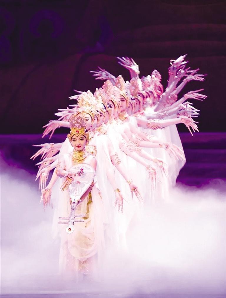 經(jīng)典舞劇《絲路花雨》歷經(jīng)45載,累計(jì)演出3952場,觀眾達(dá)537.47余萬人次,享有“中國民族舞劇的典范”“東方的《天鵝湖》”之稱。演出現(xiàn)場,劇中經(jīng)典舞蹈選段《金光千佛》《反彈琵琶》《霓裳羽衣舞》《夢幻伎樂天》為游客粉絲和廣大觀眾繽紛綻放,引發(fā)陣陣歡呼。“反彈琵琶”源自莫高窟第112窟的反彈琵琶樂舞圖,“千手觀音”還原了莫高窟元代3窟中的千手千眼觀音圖,“活著的敦煌壁畫”、獨(dú)創(chuàng)的“S”形舞姿讓游客沉浸式感受絲路文化藝術(shù)的魅力。