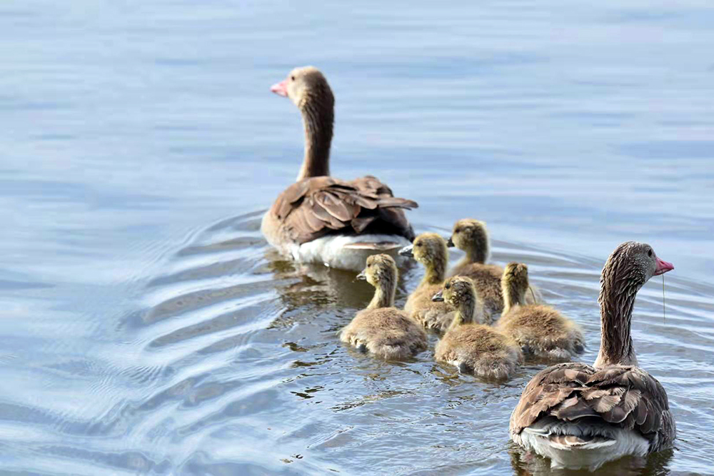 灰雁是鴨科雁屬鳥類,屬國(guó)家重點(diǎn)保護(hù)的“三有”鳥類,也是陽(yáng)關(guān)濕地的夏候鳥。監(jiān)測(cè)顯示,在陽(yáng)關(guān)濕地繁殖的灰雁家族有100多只。每年3月下旬遷飛至陽(yáng)關(guān)濕地,4月中旬筑巢繁殖,5月上旬孵化出雛鳥4至5只?;已銥?ldquo;一夫一妻”制,孵化由雌鳥單獨(dú)承擔(dān),雄鳥在巢附近負(fù)責(zé)警戒。待雛鳥破殼出窩后,則由雌雄共同撫育?;已闵阅懶?、機(jī)警,小寶寶溜達(dá)時(shí),雌鳥在前開道,雄鳥負(fù)責(zé)斷后,小寶寶上岸覓食嫩草芽時(shí),雄鳥仍然負(fù)責(zé)警戒,若有危險(xiǎn)立刻鳴叫警示。故而,近距離拍攝灰雁雛鳥是比較困難的。