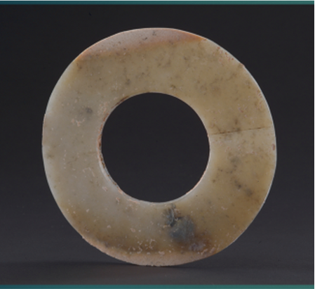 玉璧(編號總0129:4)直經(jīng)13.8厘米,單面鉆孔,大端孔徑5.2厘米,小端孔徑4.8厘米,璧面厚度不均勻,0.4~0.65厘米。