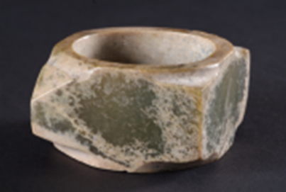 玉璧(編號總0129:5)直經(jīng)9厘米,單面鉆孔,大端孔徑4.4厘米,小端孔徑4厘米,厚度0.55—0.7厘米,璧外緣有磕碰痕。