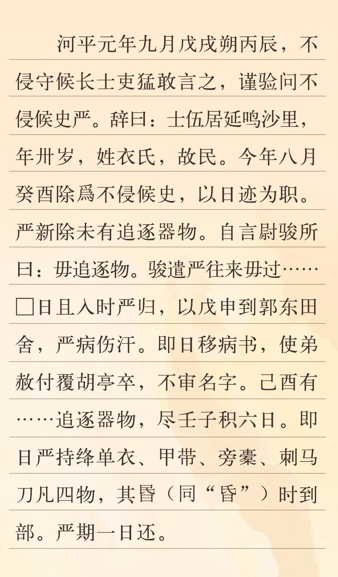 從行文方向上講,為公元前28年11月3日甲渠候官不侵部士吏孫猛向上級匯報的上行文書。主要記載了居延縣鳴沙里男子衣嚴(yán)初次擔(dān)任不侵部候史一職時,未配備追捕逃亡人員必備的器具,于是他前往塞尉駿的治所詢問,在返回途中偶感風(fēng)寒,直到10月30日傍晚時分,才帶著刺馬刀等武器返回不侵候部,超出了約定期限。