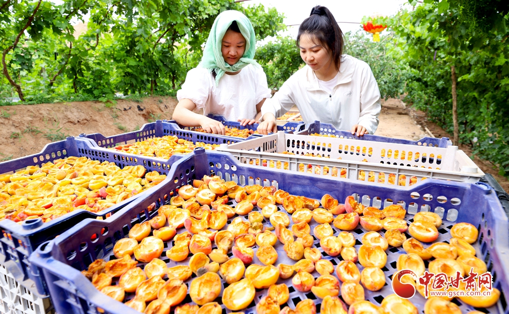 6月5日,在張掖市臨澤縣板橋鎮(zhèn),果農(nóng)們正在采摘成熟的杏子、桑葚、葡萄。