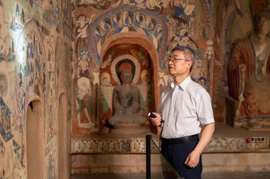趙聲良在莫高窟第285窟(復(fù)制窟)中做學(xué)術(shù)考察。敦煌研究院 供圖