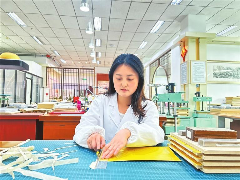 今年23歲的羅雪瑞是保護(hù)中心里的古籍修復(fù)師。她告訴記者:“在學(xué)校時(shí)學(xué)的是工藝美術(shù)品設(shè)計(jì)專業(yè)書畫裝裱方向,需要很強(qiáng)的動(dòng)手能力,這為古籍修復(fù)工作打下了很好的基礎(chǔ)。”