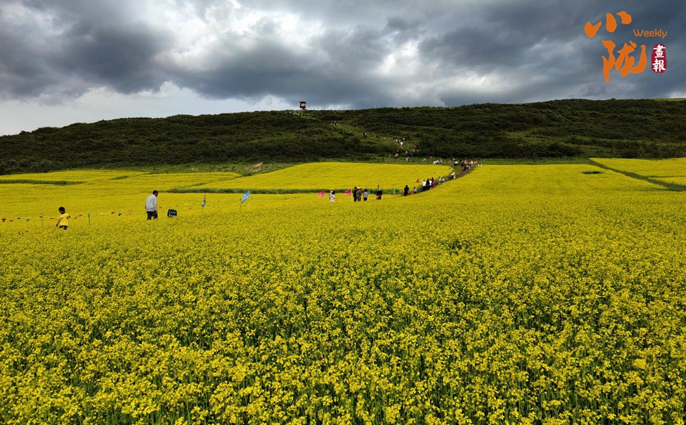 一場細雨過后,微風吹拂,金黃色的花朵隨風搖曳。游客們置身花海,賞花、拍照,盡情享受大自然饋贈的田園詩意。