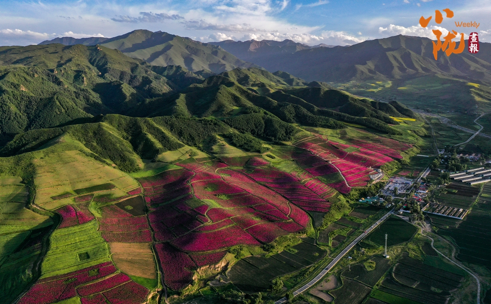 盛夏,這里高聳云天,滿山翠綠,藍天白云下,如波浪般的山坡上,金色點綴山谷,鮮黃映襯碧綠,玫紅耀眼奪目,將祁連山腳妝點的五彩斑斕。