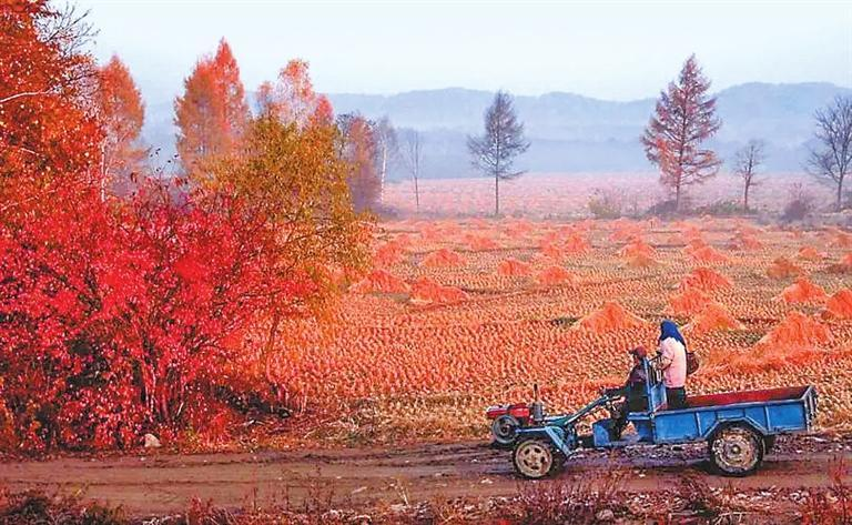 各個(gè)街口涌出的大車,宛若一條條歡快的溪流,或匯入主流奔向大道,或錯(cuò)肩而過(guò)進(jìn)入岔道。各家各戶的車把式,吆著喝著,比著拼著,迎著晨曦,向著自家豐收了的莊稼地奔去。
