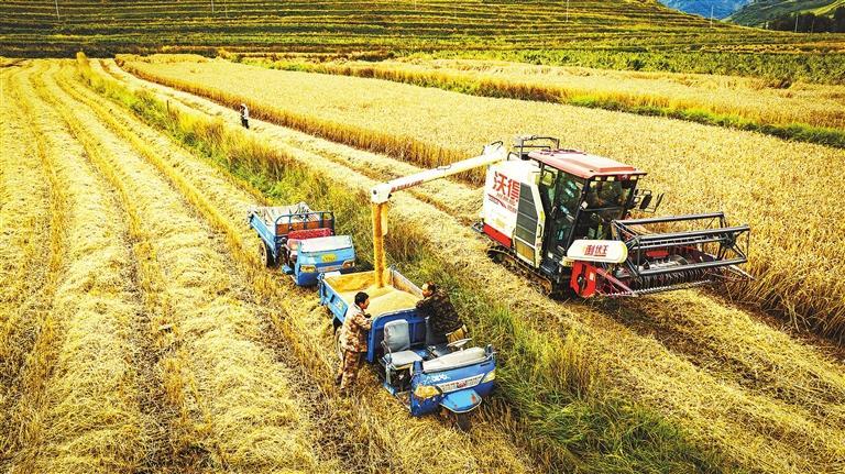 天??h朵什鎮(zhèn)萬畝梯田,農(nóng)機手駕駛收割機收割小麥。新甘肅·甘肅日報通訊員 趙世鵬