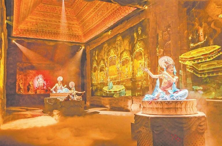 近年來,敦煌借助豐厚的旅游文化資源快速出圈,旅游項(xiàng)目供給不斷豐富,游客多樣化、高品質(zhì)的旅游需求不斷被滿足。其中《樂動(dòng)敦煌》作為全球首部洞窟式沉浸體驗(yàn)劇,自開演以來好評(píng)如潮。該劇在文化書寫、空間營(yíng)造、科技賦能、審美引領(lǐng)、研學(xué)實(shí)訓(xùn)等方面逐步拓展旅游演藝新邊界。