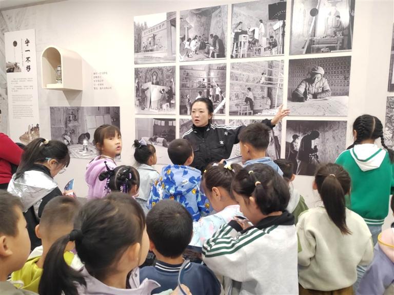 為了使小朋友們能夠身臨其境感受敦煌文化的魅力,主持人還為每一位小朋友發(fā)放了一本“敦煌小畫師”的研學手冊,并帶領大家前往蘭州市圖書館“近鄰”——敦煌藝術館進行了一場藝術研學之旅。在敦煌藝術館內,孩子們見證了第220號石窟的壯觀,欣賞了館內200余件文化展品,追溯了莫高窟的歷史淵源,了解了壁畫繪制和建筑元素的藝術審美,學習了“壁上丹青”的顏料密碼。