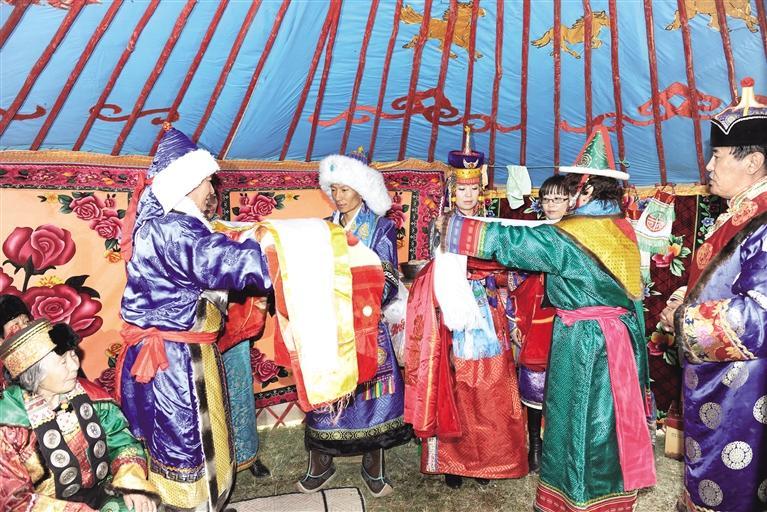 舉行婚禮之前,男家的蒙古包移至女家附近,并另立一屬新包當(dāng)新房。婚禮在婚家或新房舉行,婆家住房只做一般待客用。