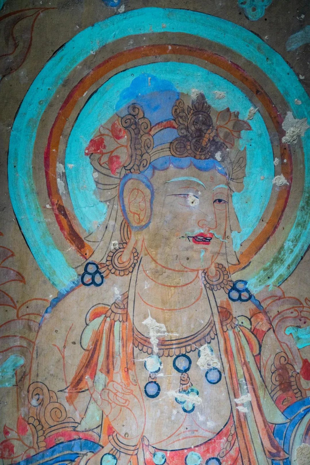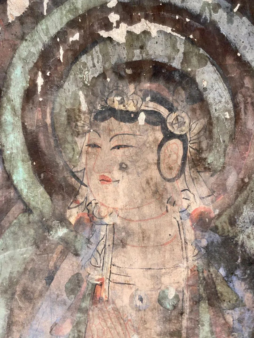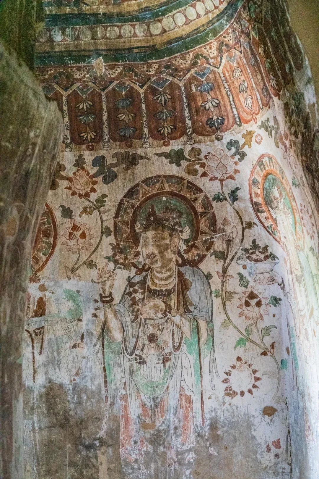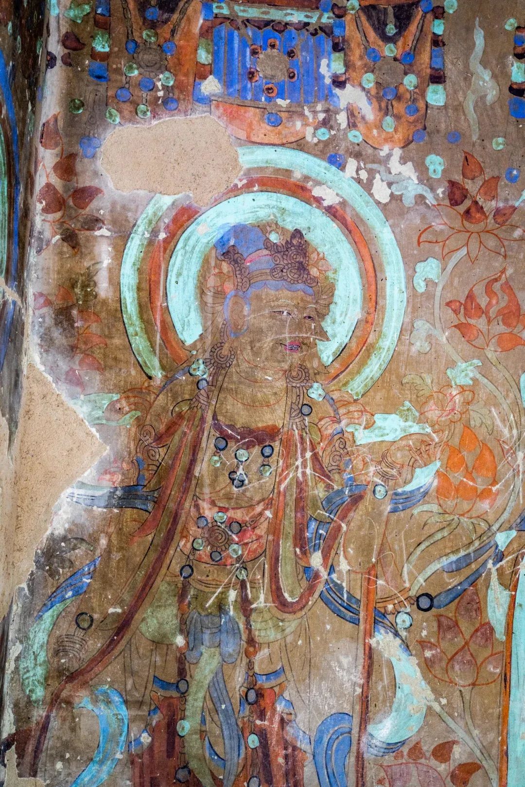 現(xiàn)在第4窟中早期塑像多數(shù)已毀,但仍殘存少數(shù)幾身,十分珍貴;各側(cè)面表層為西夏重修時繪制的壁畫;柱座與柱身的兩層自下而上逐層縮小;中心柱正面在西夏時改造成一橢圓形的大背屏,背屏正面表層為清代重繪的壁畫;四壁及頂上壁畫也多為西夏時期。
