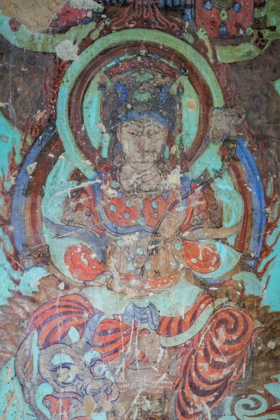 昌馬石窟中第2窟為北涼時期開鑿,后經(jīng)西夏、清代重修。甬道券頂,現(xiàn)為龜茲式中心柱窟,窟內(nèi)塑像全毀,窟內(nèi)壁畫多數(shù)為西夏時期繪制,局部在西夏壁畫之上又覆蓋有清代重修的壁畫。主室平面方形,前部橫券頂,后部中心柱,四面各開一敞口大龕。中心柱正面上半部與左右兩壁相連,各形成一個圓券形過洞。