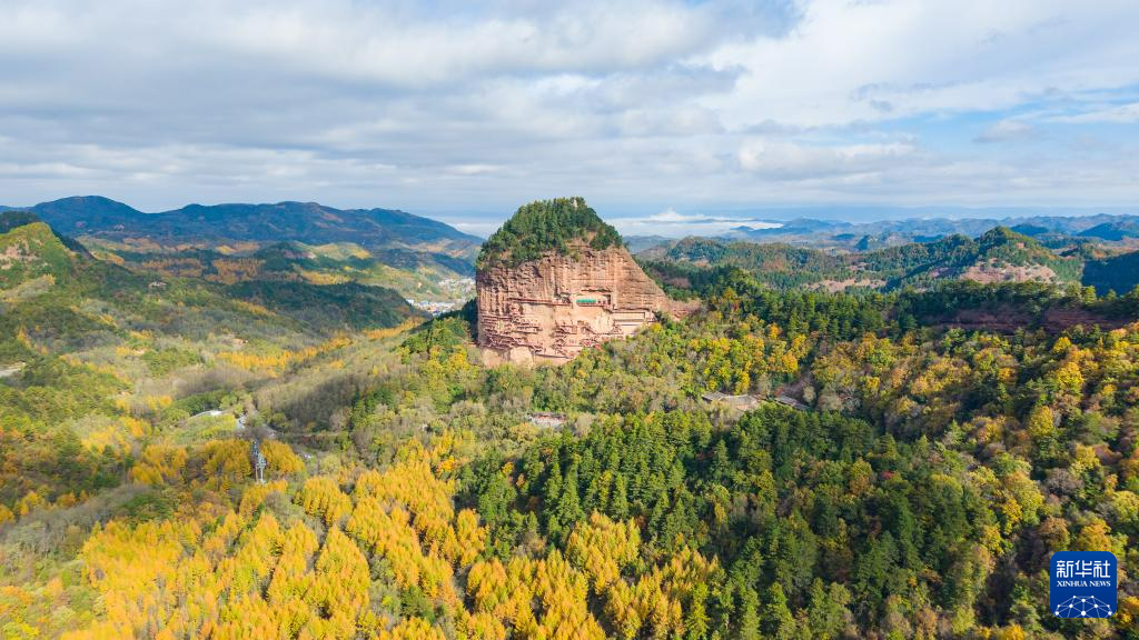 這是11月2日拍攝的麥積山石窟秋景(無人機(jī)照片)。新華社記者 郎兵兵 攝