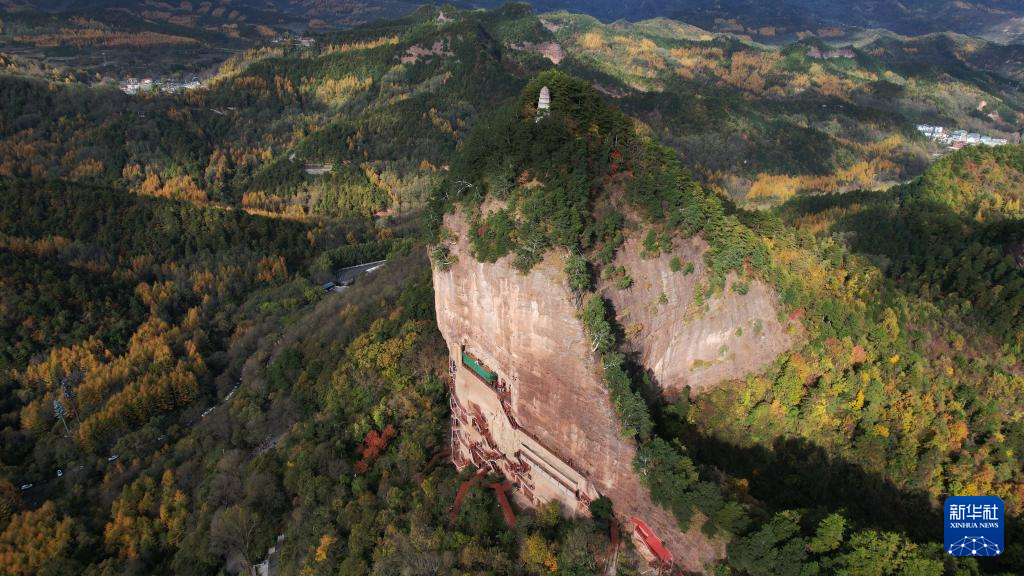 這是11月2日拍攝的麥積山石窟秋景(無人機(jī)照片)。新華社記者 陳斌 攝