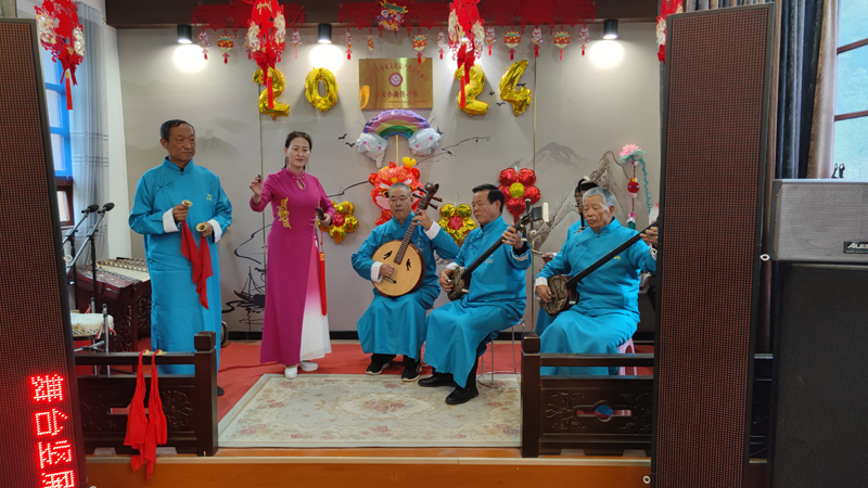 秦安縣集賢村文化活動(dòng)室內(nèi),集賢文藝劇社的社員們正在排練演唱新編秦安小曲。新華網(wǎng)發(fā)(郭林玉 攝)