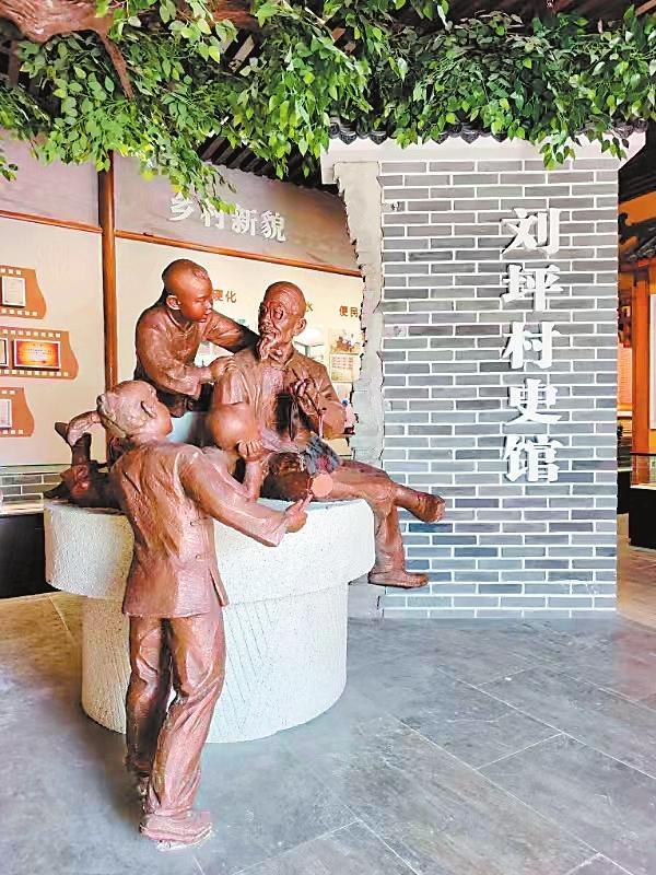 年復(fù)一年的寒來暑往中,大榆樹,也就成了劉坪村的望鄉(xiāng)臺。每個村莊,都有它的望鄉(xiāng)臺,它承載著人們共同的記憶,是人們重溫鄉(xiāng)愁的地標,永遠鐫刻在人們的心底。2000年,電視劇《黃沙下面是沃土》的劇組來到劉坪村拍攝取景,村里的望鄉(xiāng)臺大榆樹被拍進電視劇畫面。在劉坪村村史館布設(shè)中,專家和學(xué)者數(shù)易村史館方案,最終確定在村史館正門之內(nèi)塑造一組雕塑,意思是由一位老人講述劉坪村的村史,作為村史館的題眼,村史館內(nèi)還陳列了《劉坪村志》,分為建置、地理、村落文化、風(fēng)土人情等14卷,共40萬字。館內(nèi)能播放劉坪村村史專題片《耕讀傳家》。