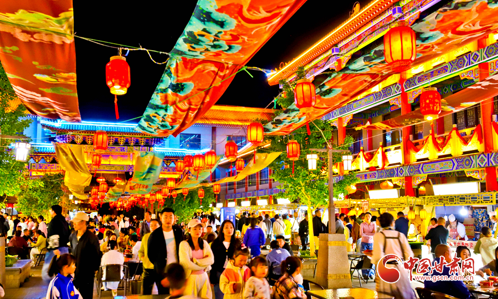 5月23日,甘肅省張掖市甘州區(qū)甘州府城內(nèi),燈光秀、書畫展、文藝展演、非遺展示令人目不暇接,美食一條街的各色美食飄香四溢,吸引眾多游客和市民前來拍照打卡,盡享夜晚美好時光。