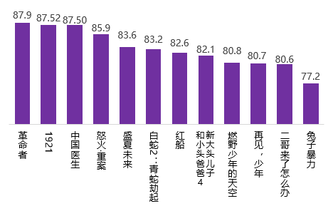 調(diào)查顯示,《革命者》《1921》《中國(guó)醫(yī)生》三部影片的滿意度得分分別為87.9分、87.52分、87.50分,分列2021年暑期檔影片滿意度排序的前三位。動(dòng)作片《怒火·重案》、青春片《盛夏未來(lái)》和動(dòng)畫片《白蛇2:青蛇劫起》滿意度居檔期第4至6位。