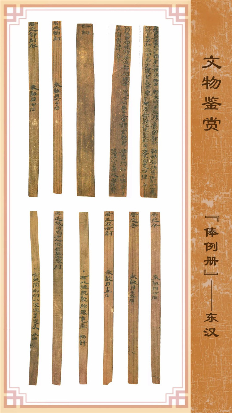 1974年8月出土于甲渠候官遺址第22號(hào)房址內(nèi)。簡冊(cè)由10枚簡組成,每簡長22.8厘米,前兩簡寬2.5厘米,其余8簡寬1.4厘米。全文200字。內(nèi)容為東漢建武三年(公元25年)竇融統(tǒng)治河西期間留下的一份完整的財(cái)政文書。簡文是關(guān)于居延都尉府吏員奉谷標(biāo)準(zhǔn)的通知,由領(lǐng)河西五郡大將軍張掖屬國都尉竇融幕府下發(fā),簡言“如律令”可知其指令具有法律效力。