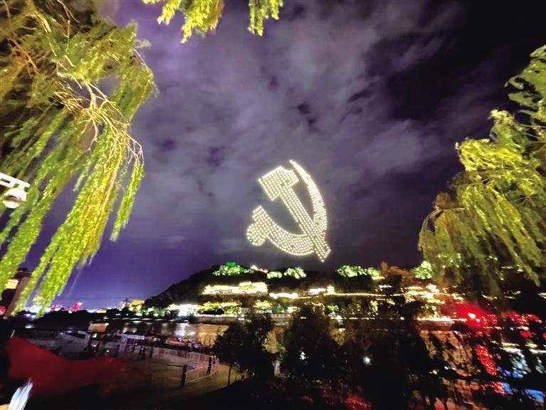 今夜的蘭州經過雨水的沖洗格外清爽嫵媚,在現(xiàn)場,600架無人機翱翔天空,照亮璀璨的蘭州之夜,無人機在遙控下變換著各種隊形和字樣,表達對黨的生日祝福。