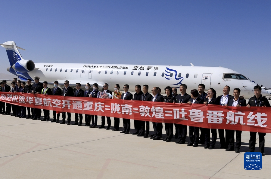 3月26日,由華夏航空?qǐng)?zhí)飛的重慶-隴南-敦煌-吐魯番往返航線正式通航,這是首航航班機(jī)組人員與機(jī)場工作人員在甘肅敦煌莫高國際機(jī)場合影。新華社發(fā)(張曉亮攝)