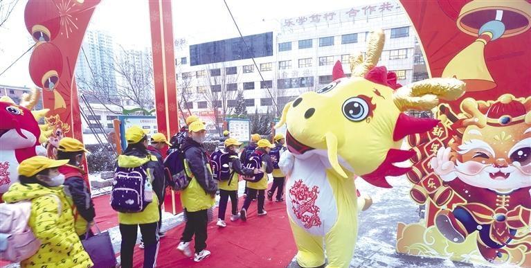 當日上午7時許,記者在蘭州市東郊學(xué)??吹?,校門內(nèi)兩邊擺放著兩條由數(shù)百個氣球組成的長龍。高年級段和低年級段的學(xué)生要穿越寫著“龍騰虎躍,前程似錦”的龍門,方可進入教室。同時,兩邊的老師,給每一位到校的學(xué)生發(fā)放小禮物。記者注意到,每個孩子都領(lǐng)到了一個小盲盒,里面裝著不同的文具。孩子們高興地揮舞著手中的盲盒,展示新春的快樂。