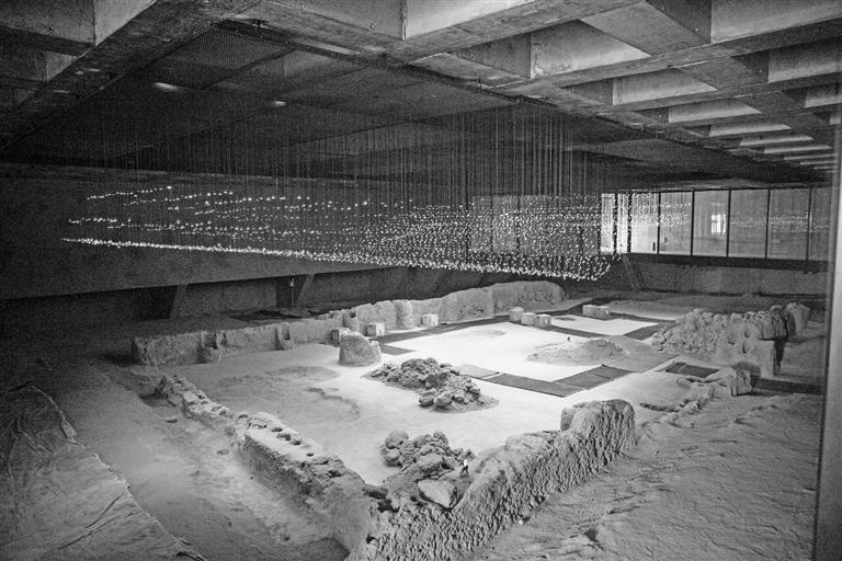 在遺址的半山中心位置有一座微微隆起的現(xiàn)代建筑,下面是被保護(hù)的大型宮殿式建筑——F901,該建筑屬于第四期文化,即仰韶晚期,約距今5000年,是目前所見(jiàn)我國(guó)新石器時(shí)代面積最大、工藝水平最高的房屋建筑。F901以長(zhǎng)方形主室為中心,主室面積131平方米,東西中軸線長(zhǎng)16米、南北中軸線寬8米。兩側(cè)擴(kuò)展為與主室相通的東西側(cè)室,左右對(duì)稱;主室后面設(shè)單獨(dú)的后室,前面有附屬建筑,前后呼應(yīng)、主次分明,形成一個(gè)結(jié)構(gòu)復(fù)雜、布局嚴(yán)謹(jǐn)、占地總面積達(dá)420多平方米的建筑群體。其居住面大部分保存完好,以輕骨料、砂石、料姜石粉混凝而成的類似現(xiàn)代水泥地面,光潔而堅(jiān)硬,它是大地灣乃至清水河沿岸的原始部落的公共活動(dòng)中心——一座宏偉而莊嚴(yán)的部落會(huì)堂。